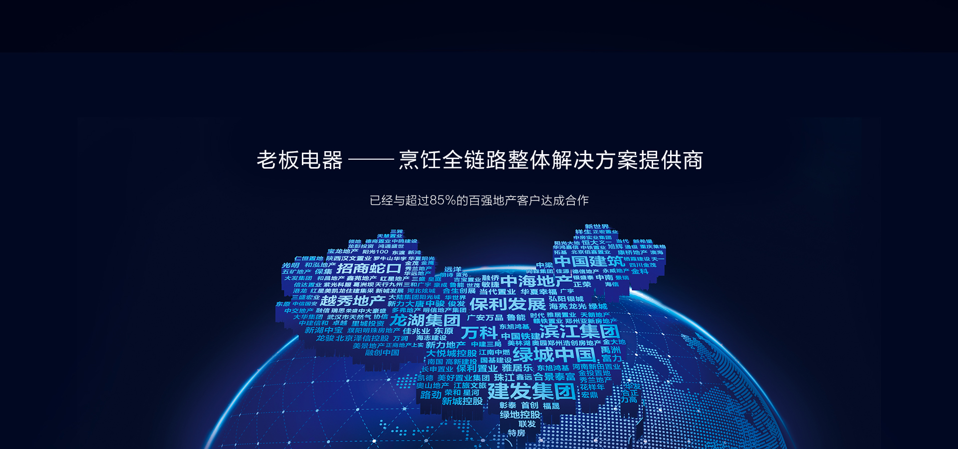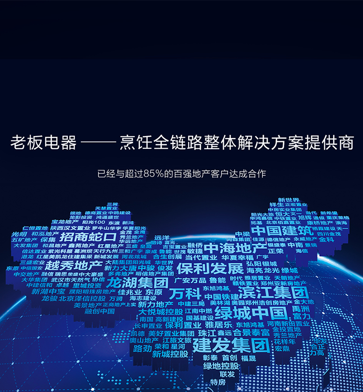 老板電器深耕精裝修渠道十余年,致力于為房地產企業提供健康智能廚房整體解決方案;目前已與超過85%的百強房企達成戰略合作,打造出近萬個高品質精裝修項目;憑借一流的人才儲備、行業領先的智能制造基地、國家級開發研究室,老板電器用高科技、環保的產品及全方位的服務,與客戶緊密連接,解決行業痛點,引領行業變革;未來,老板電器將持續以用戶需求為導向,不斷創造人類對廚房生活的一切美好向往,與地產伙伴一起共筑美好廚房美好家